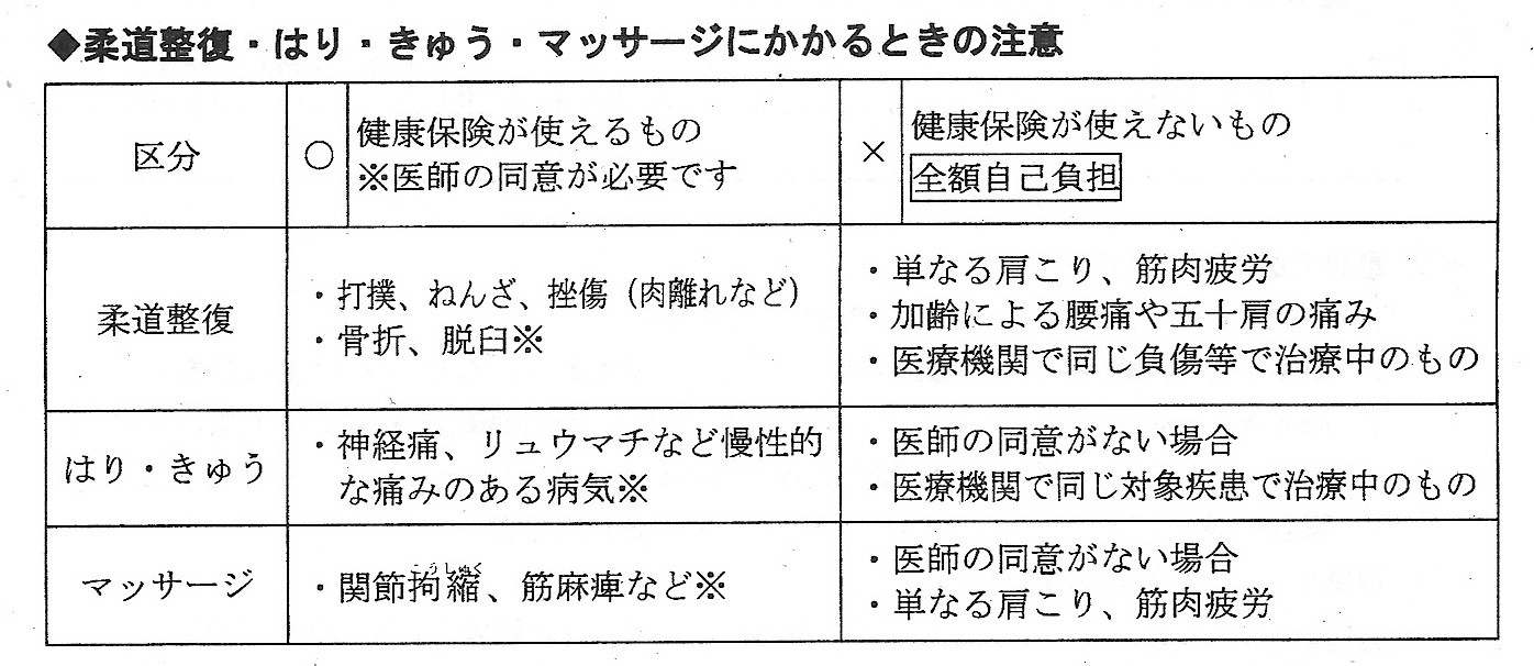 そもそも健康保険の対象となるものは、急性の(慢性化していない)けがのみです。