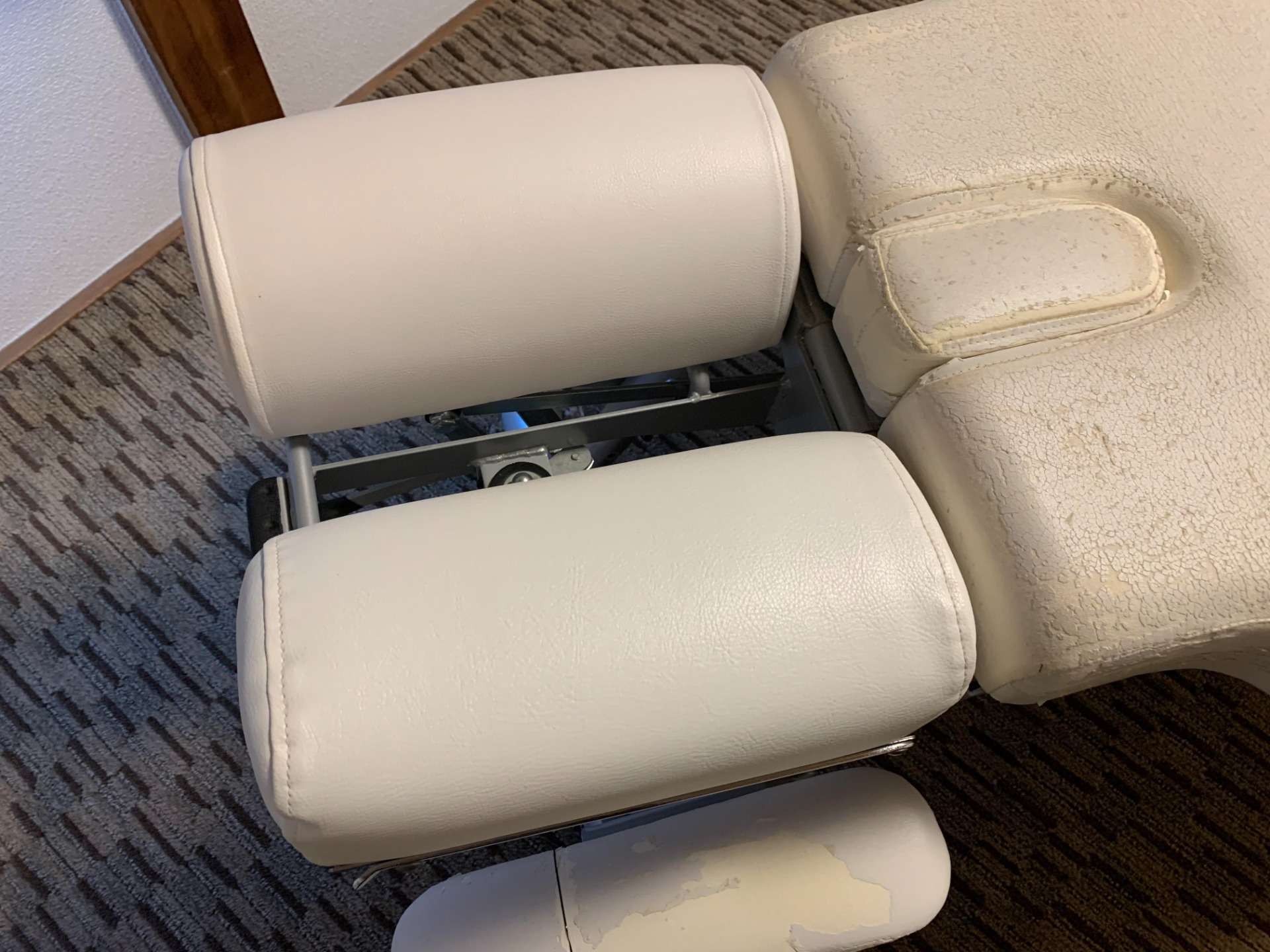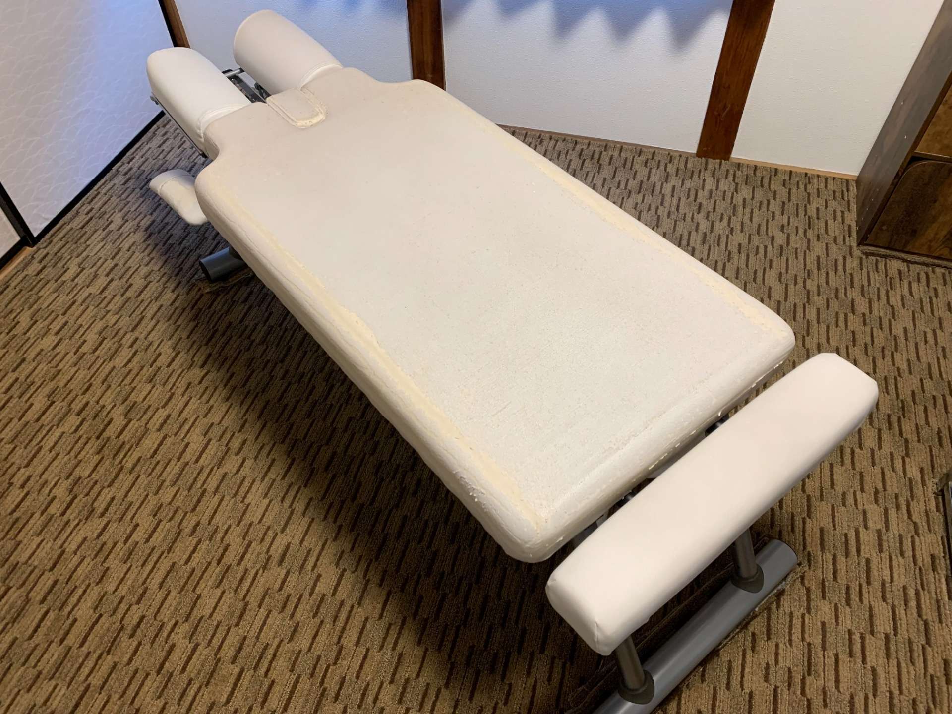 今使っているベッドは私が通っていた整体の学校から中古で購入したもので元々かなりボロボロだったので、ヘッドとフットレストのレザーは貼り直しております。