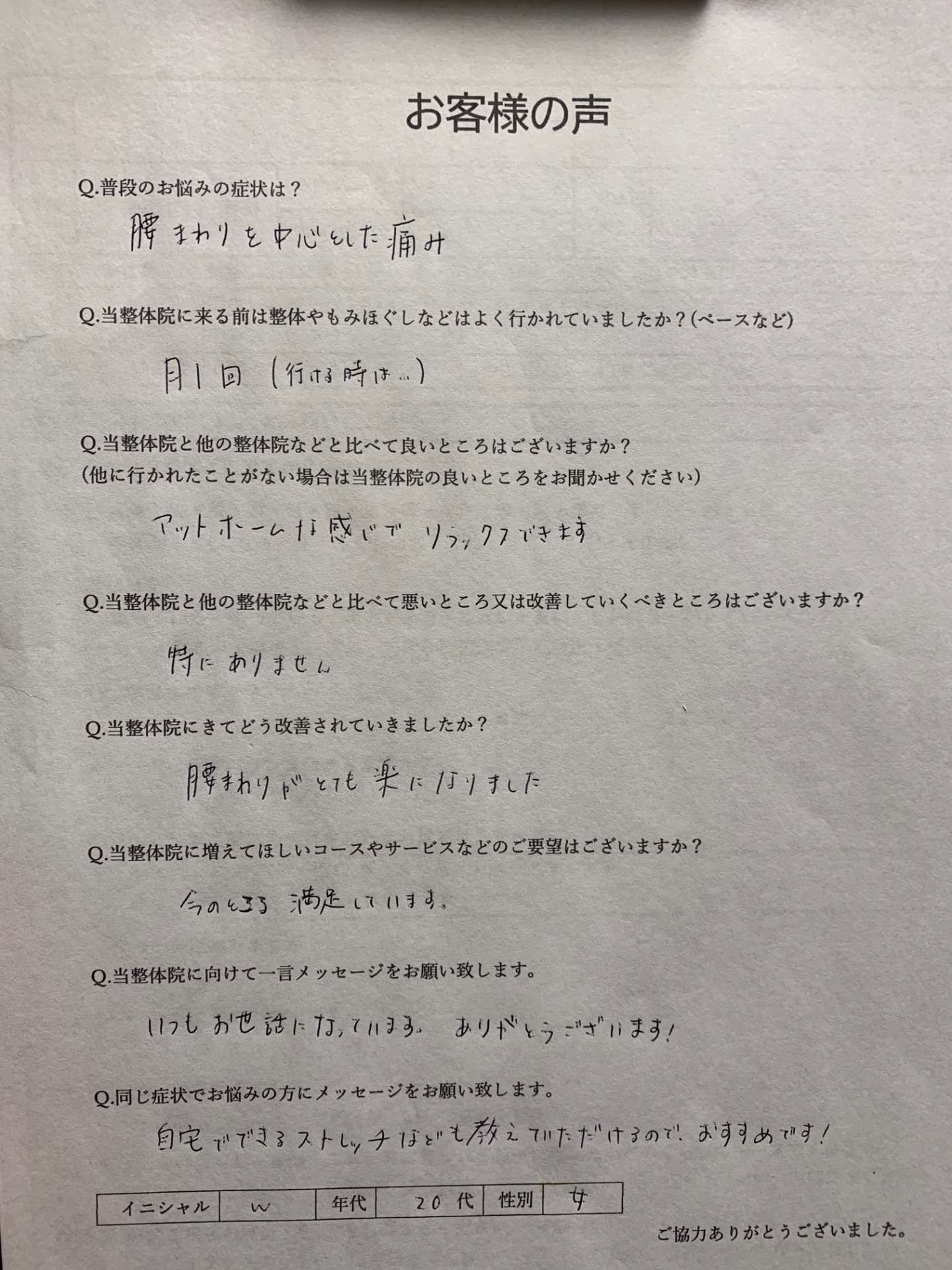 (他に行かれたことがない場合は当整体院の良いところをお聞かせください)