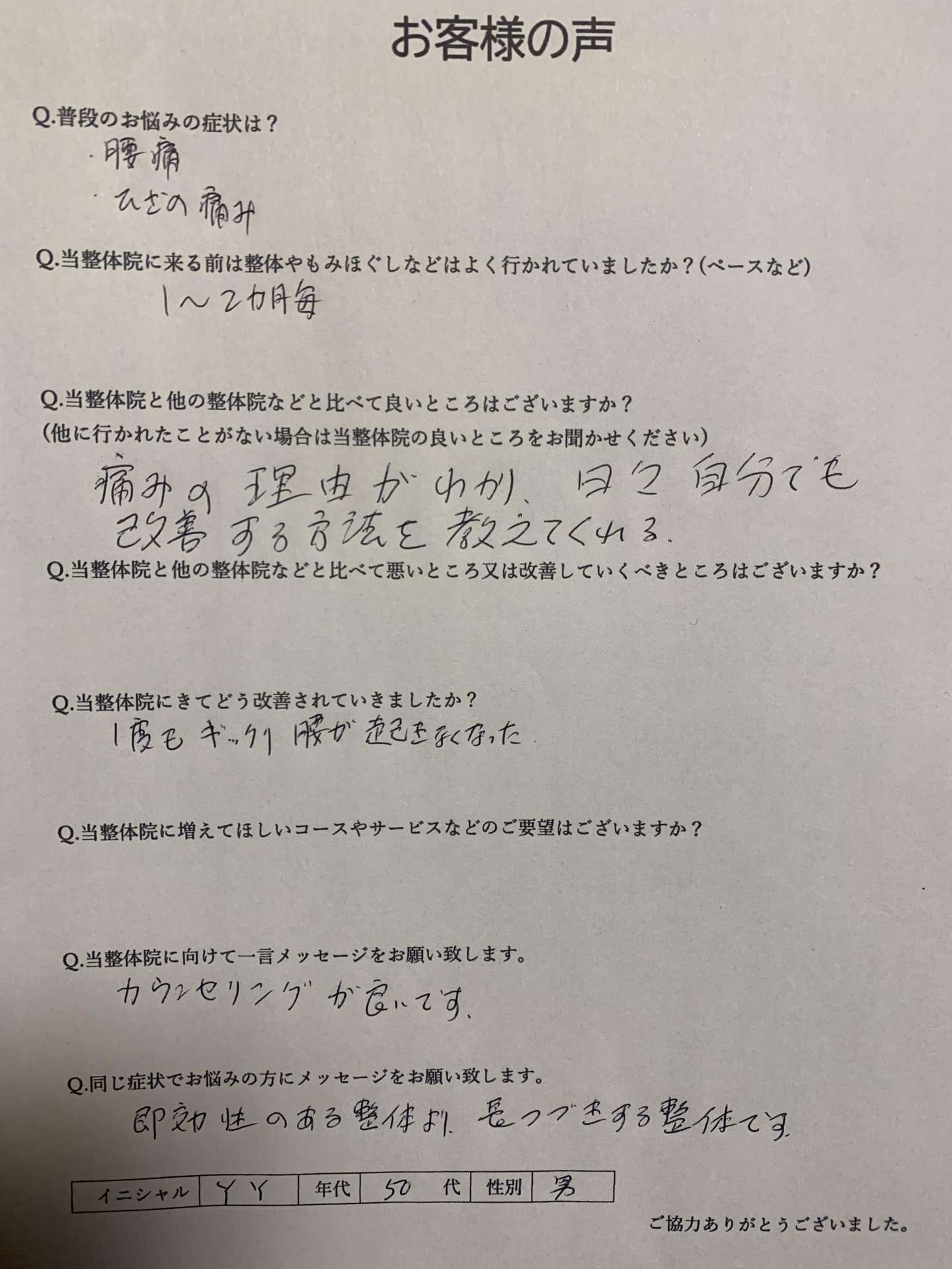 (他に行かれたことがない場合は当整体院の良いところをお聞かせください)