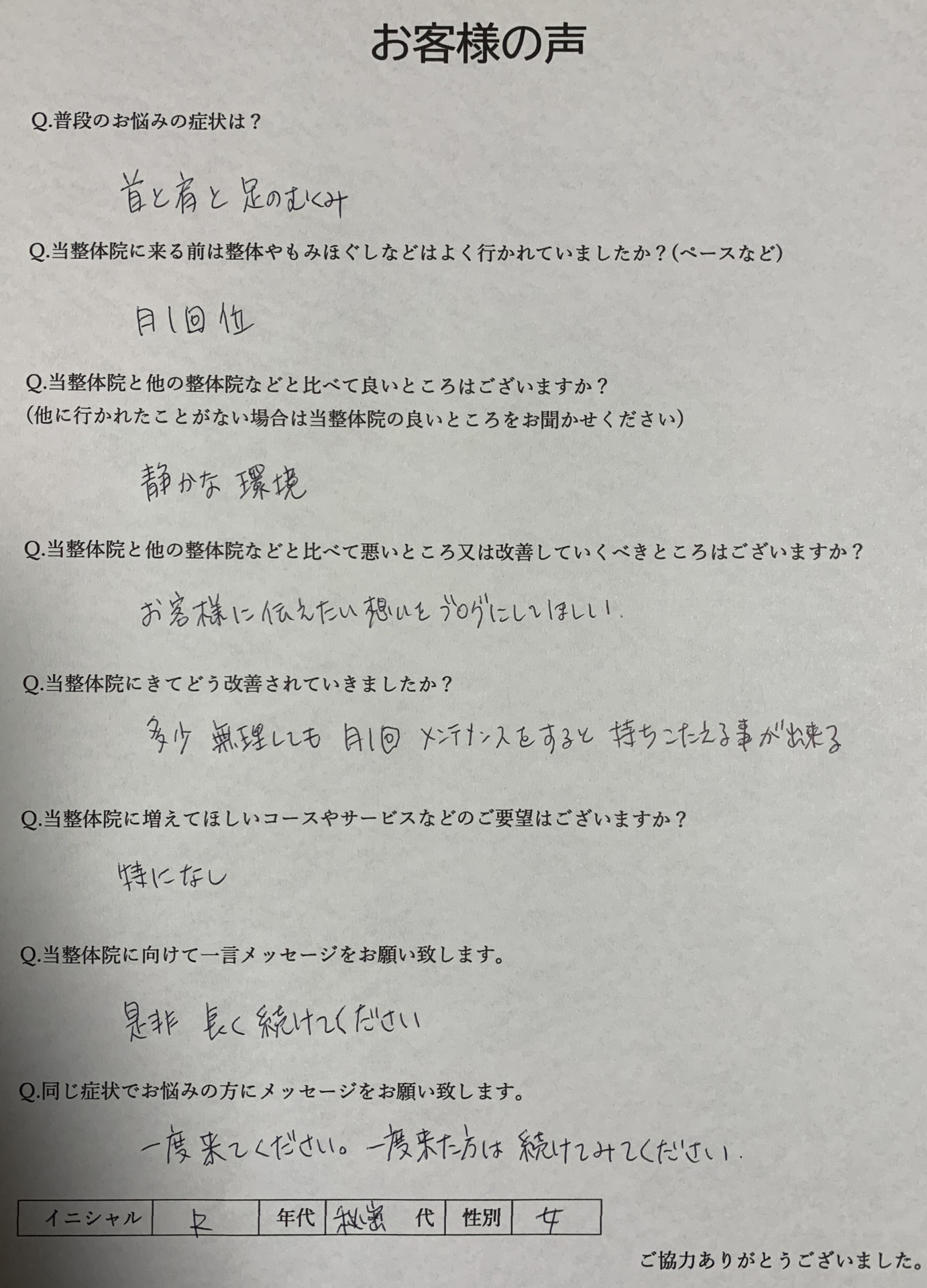 (他に行かれたことがない場合は当整体院の良いところをお聞かせください)