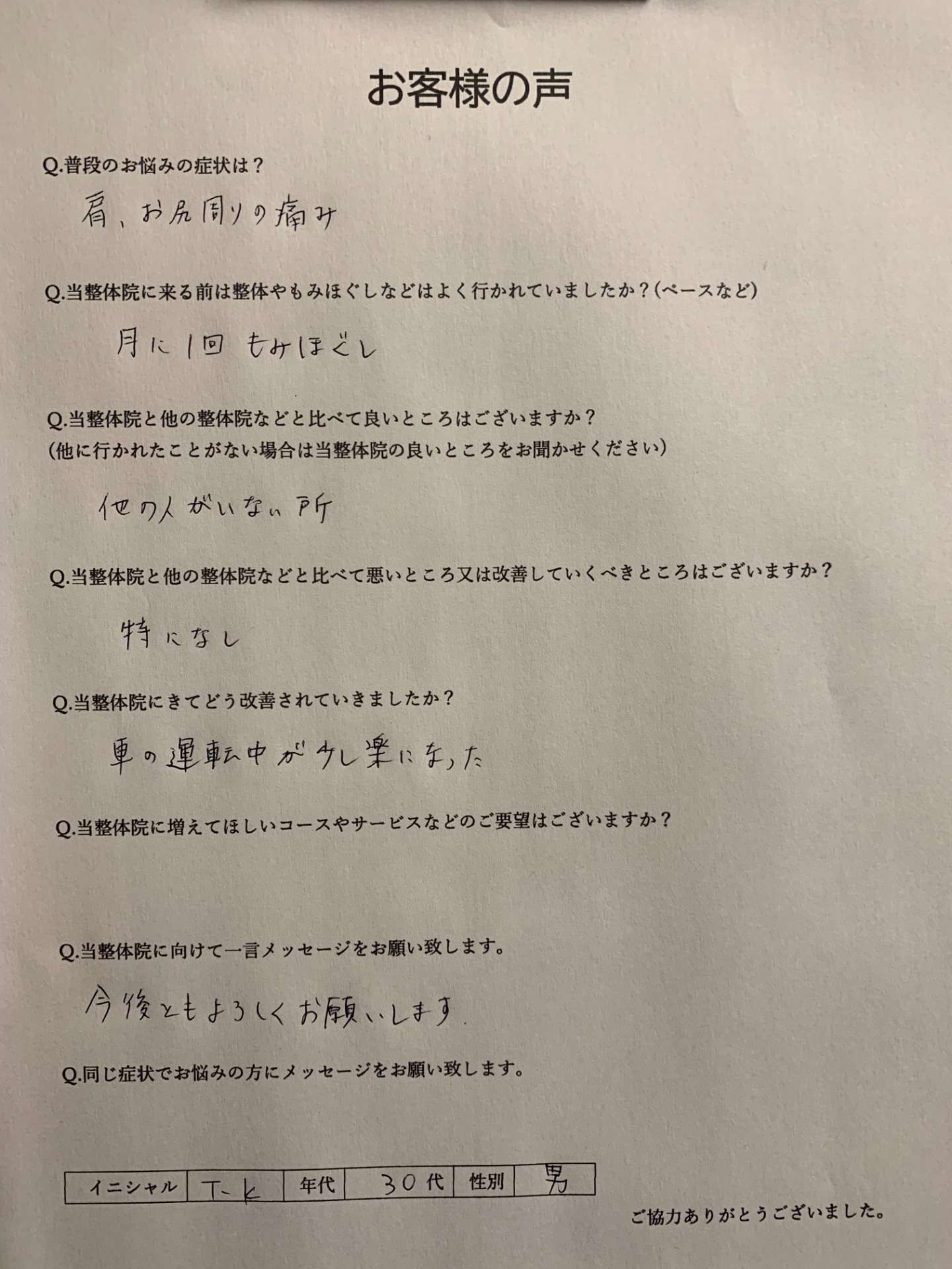 (他に行かれたことがない場合は当整体院の良いところをお聞かせください)